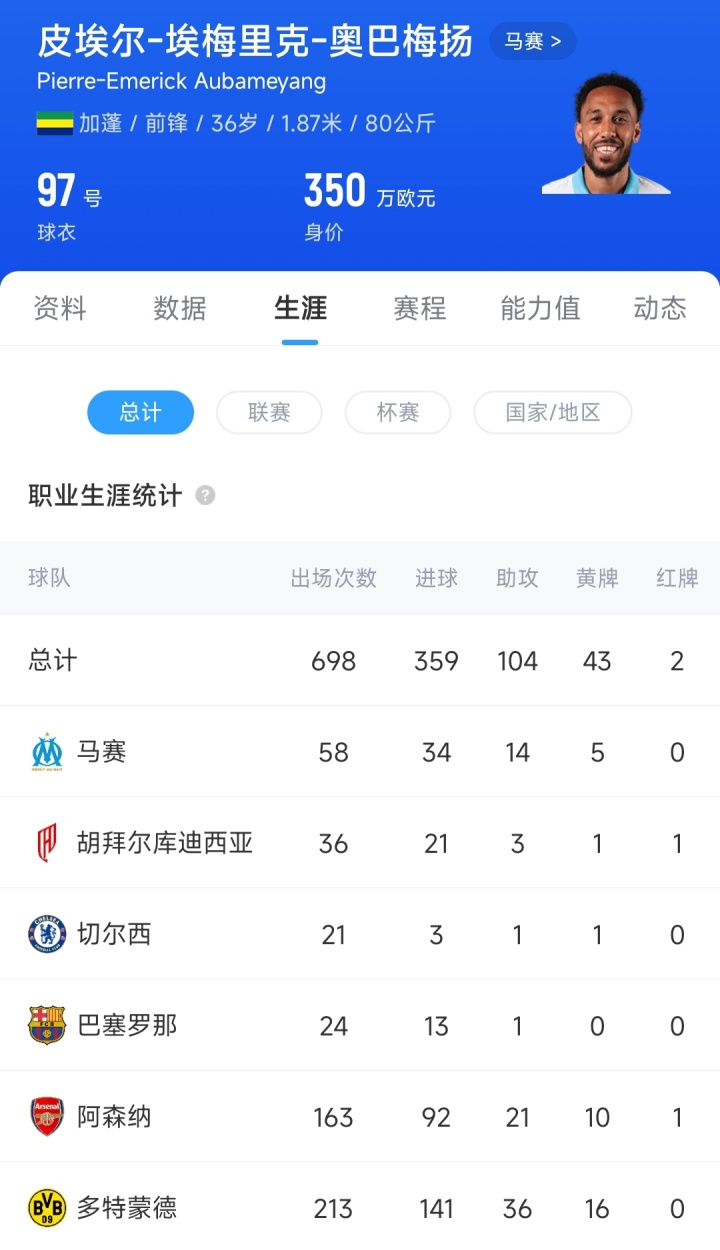 今年夏窗自由身回归马赛后,奥巴梅扬本赛季俱乐部7场比赛已经贡献了4粒进球和2次助攻,本场比赛又为加蓬国家队打入4球,他新赛季各项赛事已经贡献8球2助。